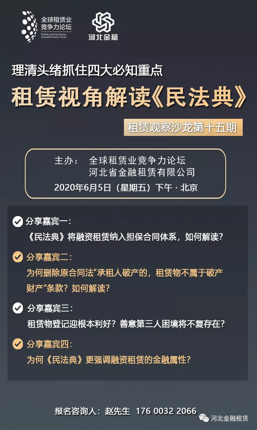6月5日下午,全球租賃業(yè)競爭力論壇與河北省金融租賃有限公司將在北京聯(lián)合主辦“租賃視角解讀《民法典》”研討會,本次研討會邀請了融資租賃專業(yè)法庭法官,金融租賃公司、融資租賃公司法務(wù)總監(jiān),律師事務(wù)所主任律師等資深業(yè)內(nèi)人士參會,共同研討和分享《民法典》實(shí)施后對融資租賃的經(jīng)營影響,租賃公司如何做好準(zhǔn)備主動應(yīng)對等主題,